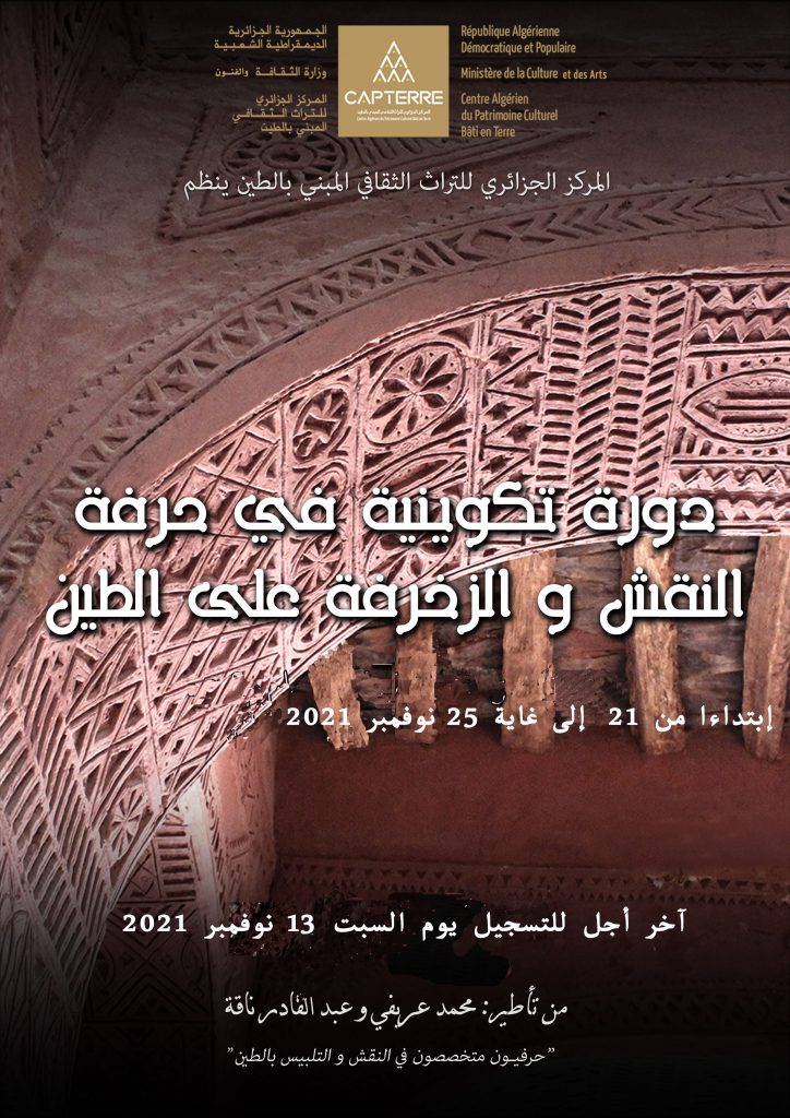 ينظم المركز الجزائري للتراث الثقافي المبني بالطين دورة تكوينية في حرفة النقش و الزخرفة على الطين من 21 إلى 25 نوفمبر 2021.آخر أجل للتسجيل يوم 13 نوفمبر 2021.